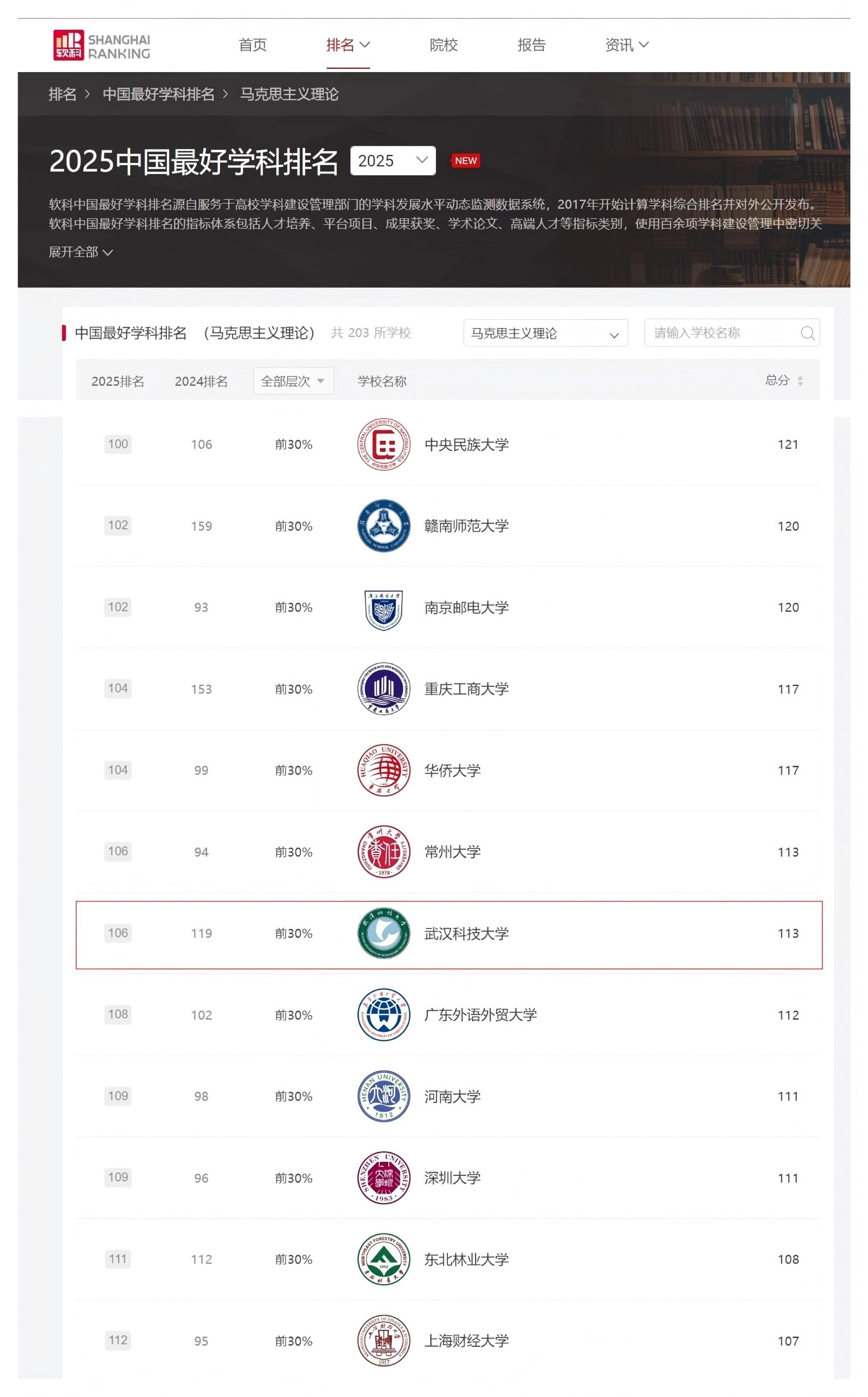 本网讯(通讯员 杨洋)2025年10月15日,高等教育评价专业机构软科正式发布“2025软科中国最好学科排名”,我院马克思主义理论学科评级为B(全国前30%),在全国高校中排名第106,比2023年上升66名(2023年排名为172名),比2024年上升了13名(2024年排名为119名),创我院学科建设历史最好成绩,也是我院学科建设方面取得的又一重大突破。