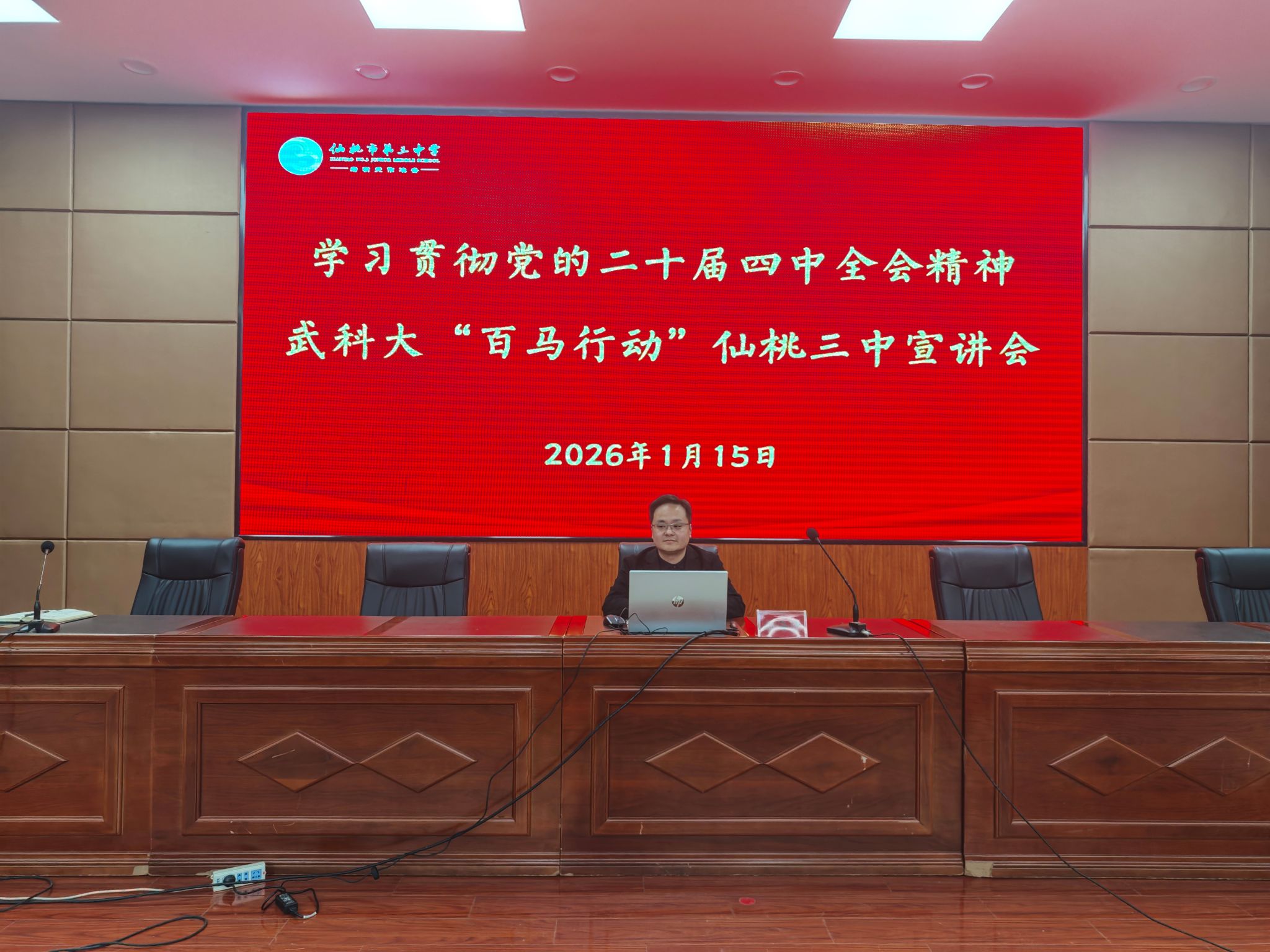 1月15日,武汉科技大学“百马行动”宣讲队来到仙桃,开展学习贯彻党的二十届四中全会精神“百马行动”宣讲活动。从市直机关到乡镇街道,从企业车间到社区村组,九场宣讲同步铺开。专题报告、座谈交流、微视频录制……多种形式交织,与基层党员干部群众“面对面”对话、“心贴心”交流,推动党的创新理论在基层生根发芽。
