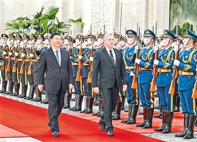 11月25日,中共中央总书记、国家主席习近平在北京人民大会堂同来华进行国事访问的古巴共产党中央委员会第一书记、古巴国家主席迪亚斯—卡内尔举行会谈。这是会谈前,习近平在人民大会堂北大厅为迪亚斯—卡内尔举行欢迎仪式。