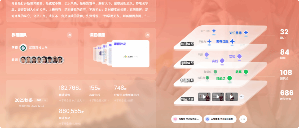 课程的影响力通过一系列数据得以印证:累计选课人数达182,766人,覆盖155所选课学校,师生累计互动880,555次。这些数据背后,彰显着课程持久的生命力与广泛的认可度。
