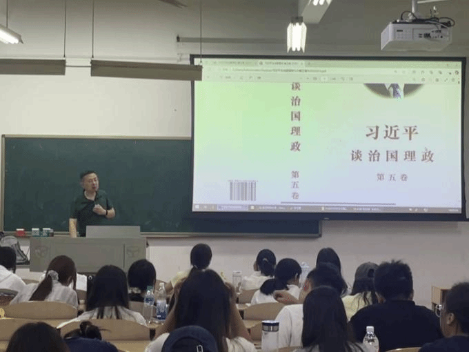 今年7月出版的《习近平谈治国理政》(第五卷)是全面系统反映习近平新时代中国特色社会主义思想最新成果的权威著作。高校思政课将党的创新理论最新成果融入课堂,用科学理论武装青年学生头脑意义重大。而面对不熟悉党史的青年学生,如何进一步将党史故事和经典理论讲活,是广大思政课教师持续探索的课题。9月19日下午,我院教授张齐武在“概论”课堂上讲授第四章“社会主义建设道路初步探索的理论成果”时,并没有停留在对史实的简单介绍,而是将《习近平谈治国理政》第五卷第五章“一体推进教育科技人才事业发展”中的重要论述引入课堂,启发同学们对马克思主义中国化时代化的思考。张齐武特别向同学们指出,“在上世纪五十年代,党就提出了“向科学进军”的口号,后又强调“四个现代化”关键在科学技术现代化,其思想精髓和真理认识一直延续发展至今”。他认为:“将总书记的最新重要论述与‘概论’课程的理论阐述相结合,搭建一座连接历史与当下的桥梁,将我校学生特别关心的生产力发展、科技创新等议题与经典理论结合起来,有助于让思政课真正走进学生心里,形成‘见人见事见精神’的课堂实践”。