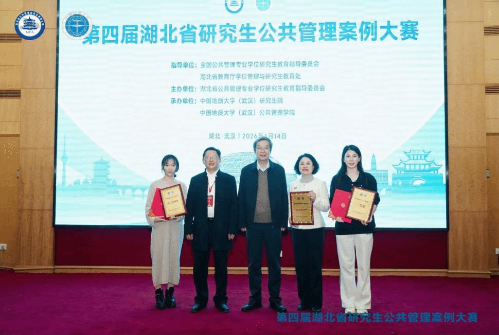 本网讯 3月14日,第四届湖北省研究生公共管理案例大赛在中国地质大学圆满落幕。我院参赛队伍表现优异,斩获湖北省二等奖、最佳案例奖和最佳指导老师奖等重要奖项。这是我院首次在该项省级高水平赛事中取得佳绩,实现历史性突破。