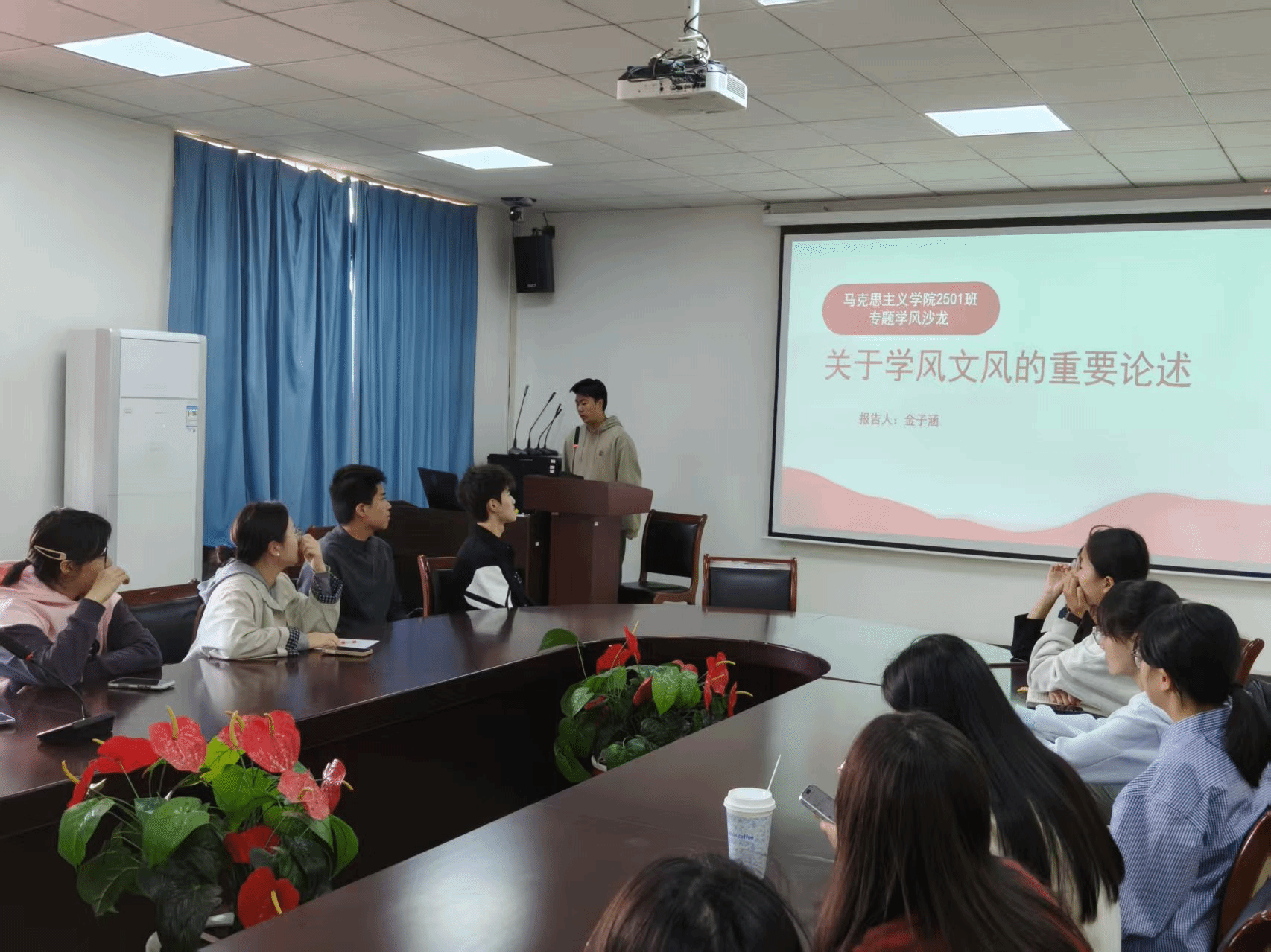 会上,学习委员金子涵首先以“学风文风建设”为主题,系统讲解了党关于学风文风建设的重要论述。围绕“坚持理论与实际相统一、坚持知行合一、坚持学习与运用相统一”等核心要点,以马克思主义为思想指南,引导同学们深刻理解理论联系实际的优良作风。金子涵通过生动讲解,不仅为班级学风文风建设明确了方向,更为营造良好的班级学习氛围打下了坚实基础,有效督促了同学们践行知行合一、理论联系实践的学习要求。