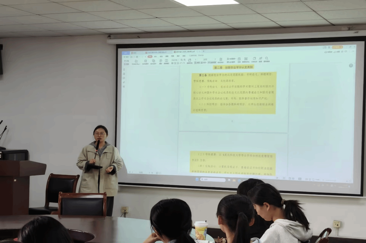 班主任董老师则聚焦《武汉科技大学“创新创业学分”认定管理办法(修订)》,为同学们详细解读创新创业学分政策。董老师首先强调了创新创业学分的重要性,随后系统介绍了学分认定范围及申请认定程序,并特别针对马克思主义学院学生,重点讲解了“全国大学生职业生涯规划大赛”、“全国高校大学生讲思政课公开课展示”等特色项目。同时,董老师以“路径多元”的说明有效缓解了同学们的顾虑,希望大家保持平和心态,按照文件要求稳步推进,合理规划时间,积极报名参与各类比赛,丰富自身经历。